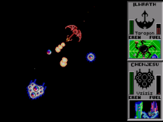 The Mmrnmhrm are best mates with the Chenjesu, a friendship that would lead to the creation of the devastating Avatar battleship in Star Control 2, but in this original their ship is interesting, but ultimately pretty average. As you may have guessed from its name, this craft is able to alternate between two forms. The first and default form is a slow but maneuverable one with twin short-range Laser cannons. With the tap of a button, however, its wings sweep back and its powerful afterburner kicks in, turning it into a fast, long-range craft which fires twin, long-range homing missiles. Both forms come with problem though – the first form is very slow and the second has a horrendous turning speed meaning it’s basically only usable in a straight line. The trick is to attack with the lasers, retreat with the faster craft, wait until the fuel reserves build back up, then zoom in close to your opponent and, change back, and let rip with the lasers. It’s a sound tactic but the ship is pretty clumsy in practise. It can be reasonably effective but isn’t particularly enjoyable to use.